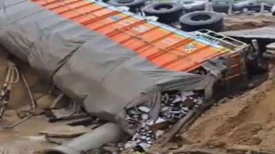 पेरीफेरल एक्सप्रेसवे पर धंसी सड़क, पलटा बीयर से भरा ट्रक