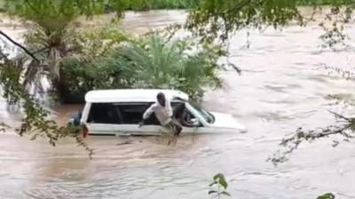 सरकारी गाड़ी को बहा ले गया पानी का सैलाब—खजूर के पेड़ ने रोक ली मौत, मेडिकल ऑफिसर्स ने कूदकर निकाली जान