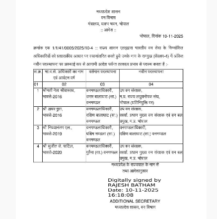 इस तरह विभाग ने एक साथ सात अधिकारियों के तबादले करते हुए बालाघाट से लेकर मुरैना तक बड़े स्तर पर फेरबदल किया है.