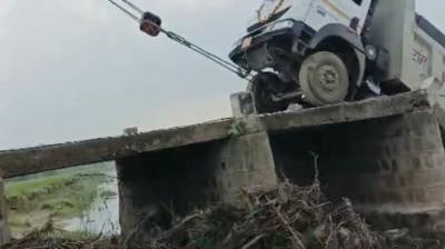 रेत भरे ट्रक का भार नहीं झेल पाया पुल, छतरपुर में ढहा पुल — बाल-बाल बचे लोग